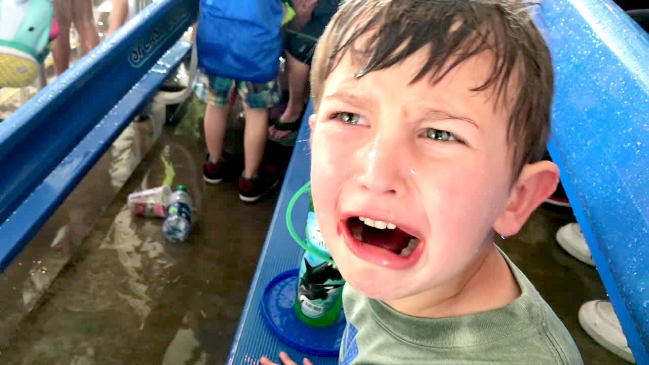 A family sits in the stands at a whale show at an aquarium. The whales hit their tails against the water and splash the crowd with water and a young boy gets wet. He gets upset and yells "let's get out of here." Featured talent cleared (the upset little boy).