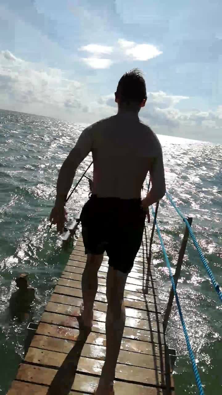 A teen boy tries to jump off the end of a pier but gets stuck on a rope and hangs above the water.