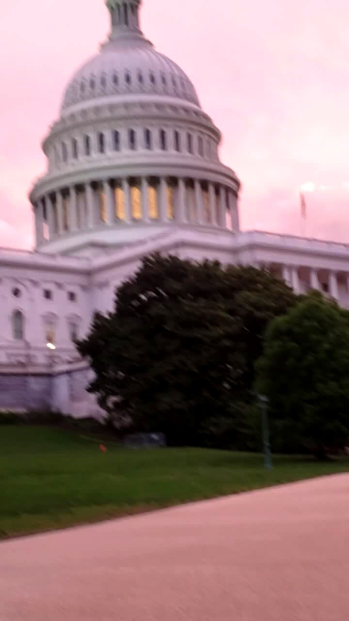 A woman rides a scooter down a sidewalk at the Capitol Building but swerves and falls down and another woman films and yells at her not to break a hip.