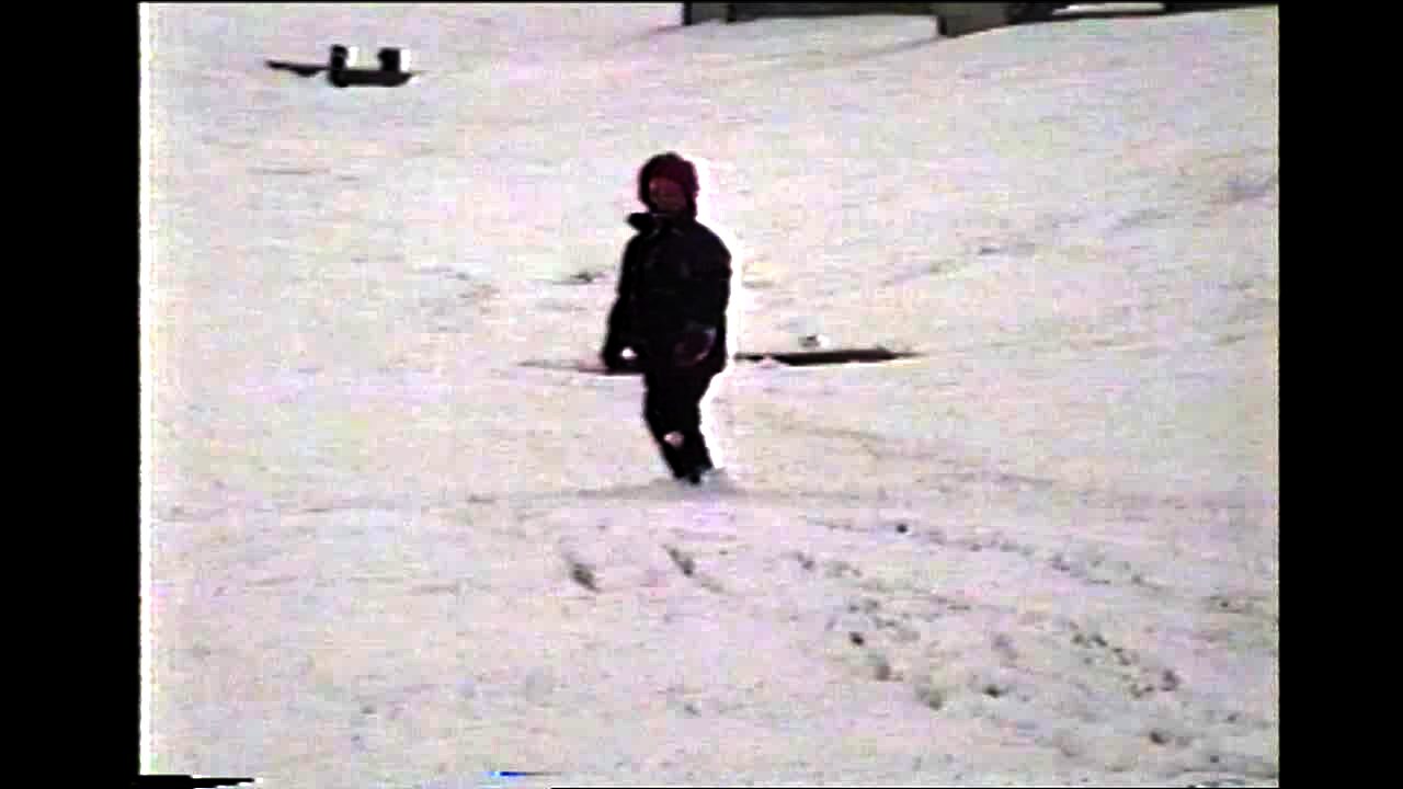 Snow Fall. Kid runs to jump on inner tube, falls face first in the snow.