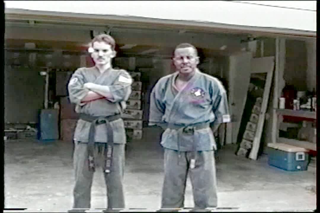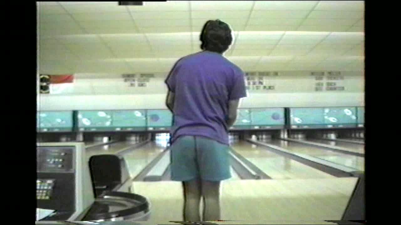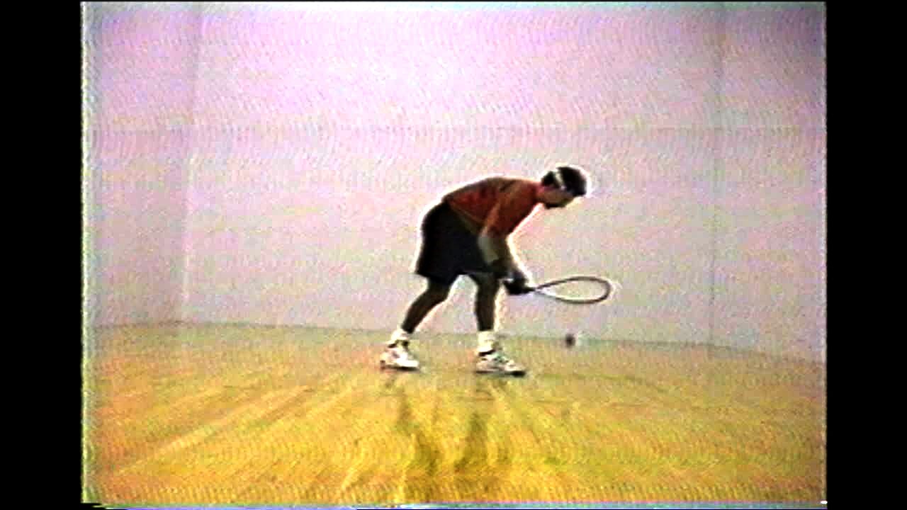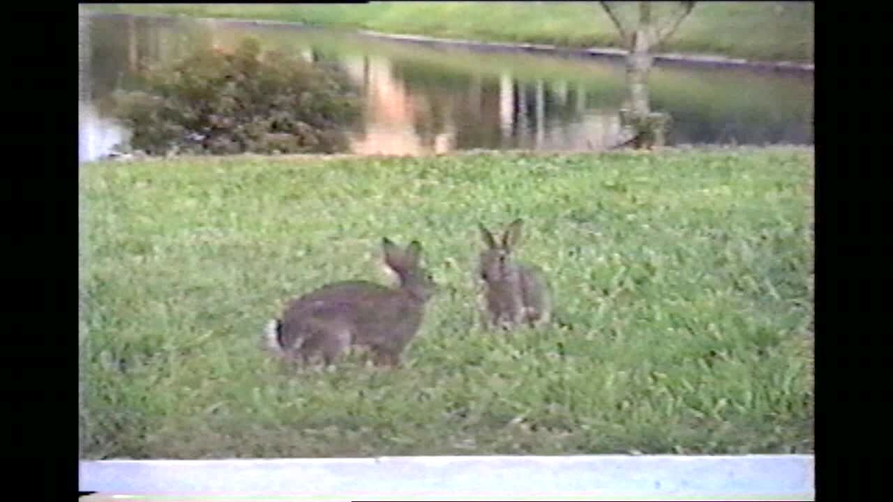 Man in red jogging suit is attacked by goose. Man runs away, trips, falls. Animal revenge. .