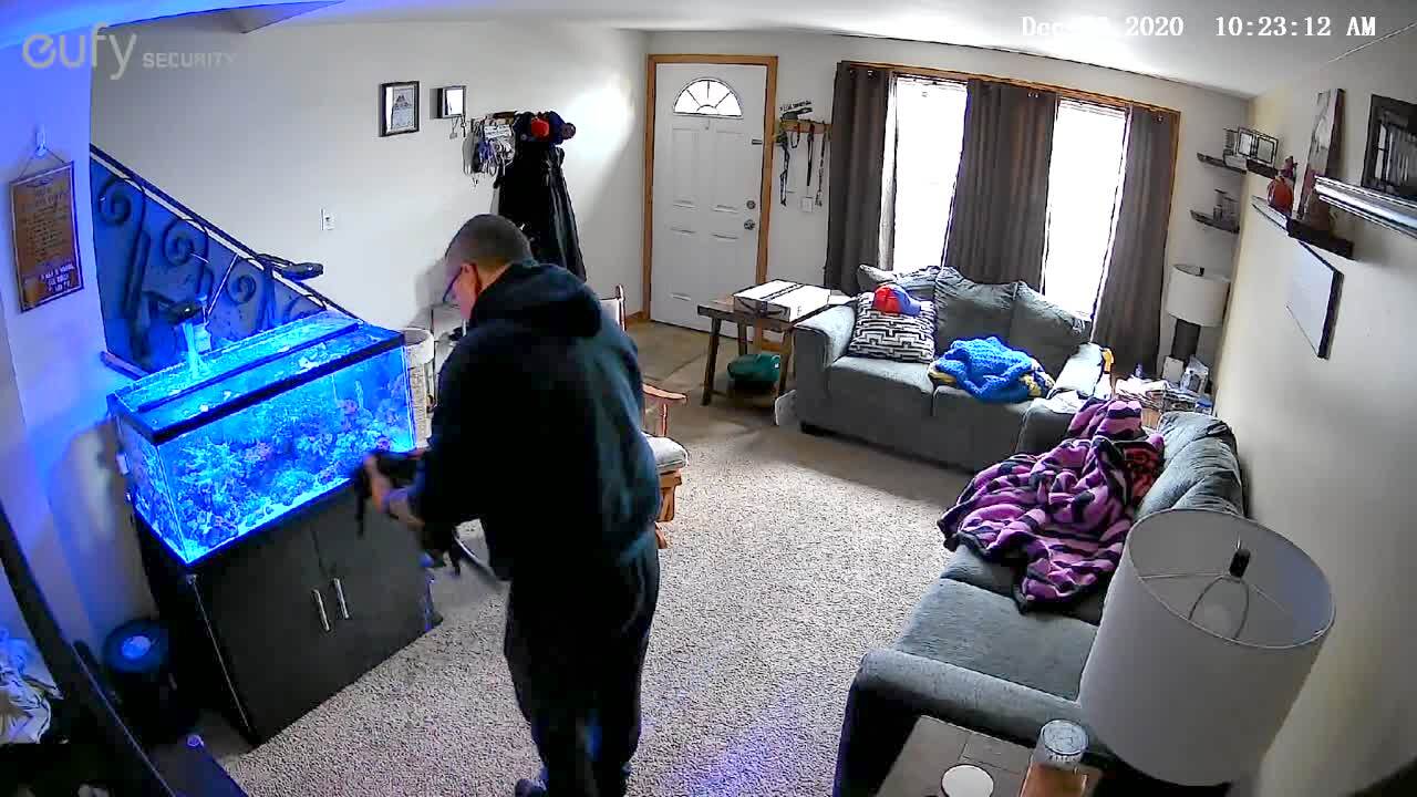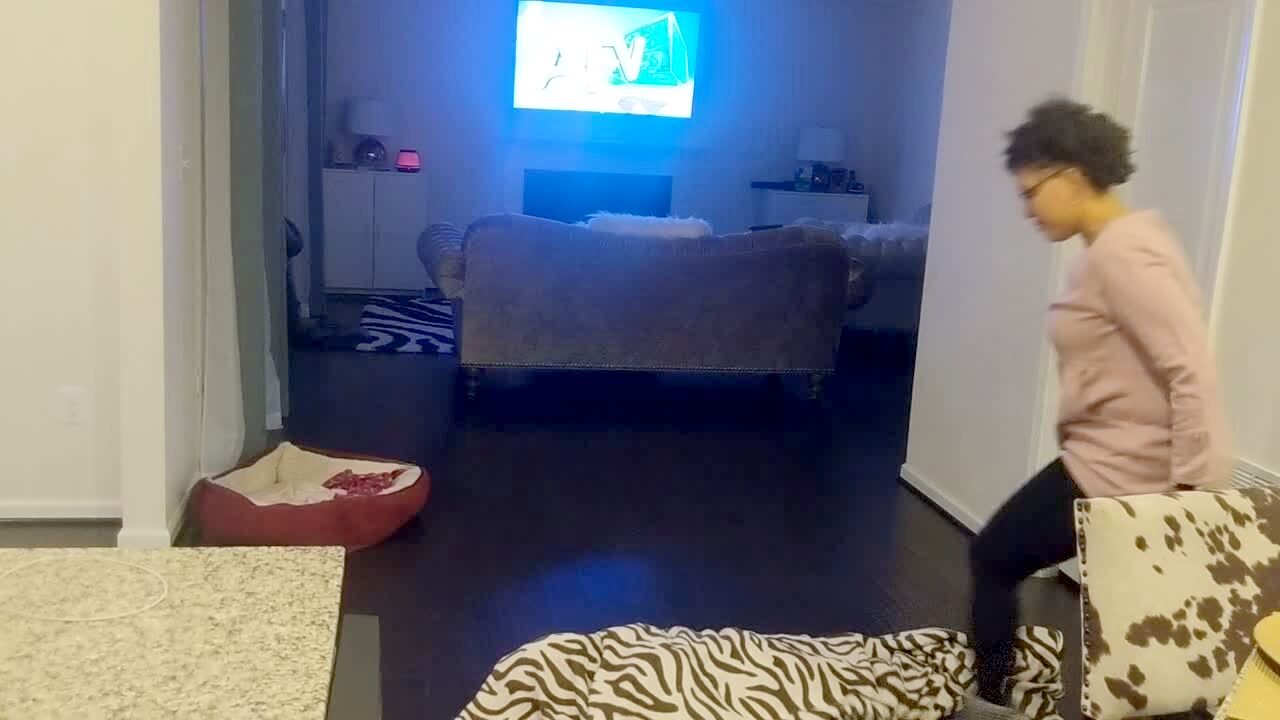 A young boy does the disappearing human trick in the living room and his mom helps put a blanket on him to hide. The dog comes back with the toy and stands still. After the dog does nothing for a little while, the boy pops out from under the blanket.
